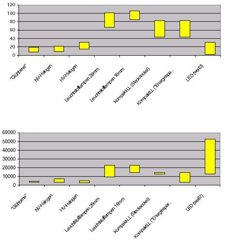 Hier sehen Sie den Unterschied in der Energie-Effizienz einiger üblicher Leuchtmittel in Lumen pro Watt (lm/W). Das gelbe Feld stellt die Spannbreite der Effizienz der verschiedenen Typen bei normalem Betrieb dar. Die Effizienz kann bei Dimmung signifikant sinken.