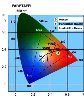 In einem karthesischen, zweidimensionalen Koordinatensystem wird eine Kurve mit den Spektralfarben aufgetragen, wobei der Kurvenzug von der Purpurgerade geschlossen wird. Bei x = y = 0.333 liegt weiss; Die im Farbdreieck verlaufende Kurve enthält die Temperaturwerte in Kelvin, auf die ein Planckscher Strahler gebracht wurde, um die eingetragene Farbtemperatur mit dem dazugehörigen kontinuierlichen Spektrum zu emittieren.