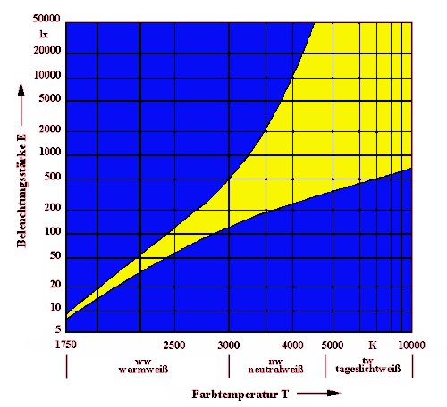 Je niedriger die Beleuchtungsstärke wird, umso wärmere Farbtemperaturen müssen gewählt werden, um ein Behaglichkeits- empfinden zu erzeugen. Wir haben also bei einer Glühlampe mit 2800 K Farbtemperatur bei 150 lx das gleiche Behaglichkeitsempfinden wie bei einer tageslichtähnlichen Leuchtstofflampe mit einer Farbtemperatur von 3500 K bei 500 lx Beleuchtungsstärke. Die gelbe Fläche des Kruithoff- Diagramms gibt also den “Grünen Bereich” an. Unterhalb dieser Fläche verspüren die meisten Menschen ein subjektives Kältegefühl.