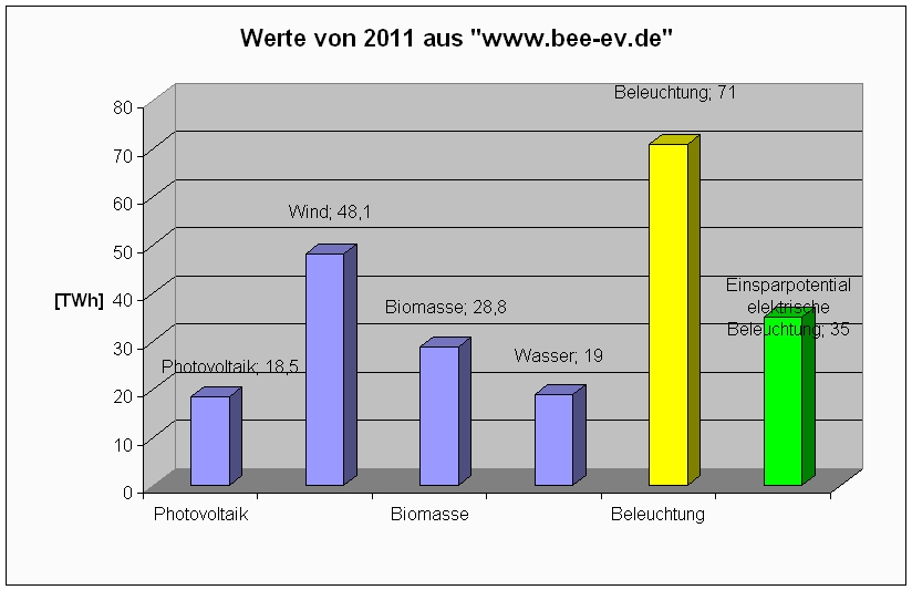 Beleuchtung Seit etwa 20 Jahren befasse ich mich mit den Möglichkeiten der Stromeinsparung durch Anm.: Die alte Homepage www.lichtsysteme.de wurde von mir nun zum 1.1.2013 ins Archiv geschoben, da sie nur noch Referenzcharakter hat. Sie wurde seit 2005 nicht mehr überarbeitet und ist daher schon lange nicht mehr aktuell. Somit ist sie nur noch von historischem Interesse! Aktuell bekommen Sie von mir Lichtplanungen für Innen- und Außenräume (mit RELUX) und neutrale Beratung bei der Auswahl der für Ihre Belange geeigneten Lichttechnik. Das wirtschaftlich darstellbare Einsparpotential in Deutschland im Bereich der elektrischen Beleuchtung beträgt nach meinen Abschätzungen etwa 50% der vom UmweltBundesAmt genannten 71 TWh Jahresverbrauch. ![]() Mit den Möglichkeiten vom Stand der Technik 2016 sind mehr als 40 TWh an elektrischer Endenergie wirtschaftlich ersetzbar. Dies ist immerhin zweimal mehr als aller Strom aus Wasserkraft in Deutschland inklusive aller etwaiger noch vorhandener Ausbaupotentiale! Konkrete Beispiele aus der Praxis: 1. T8 ist meist effizienter als T5 (und nicht umgekehrt!) am Beispiel einer Kfz-Werkstatt in Dingolfing