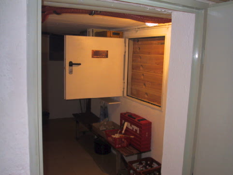 - Zuletzt noch ein Blick auf den gemauerten Pelletlagerraum mit 9 m³ Inhalt für 5 t saisonal gespeicherte Sonnenwärme (Anm.: Es erwies sich letztlich als günstiger die bereits vorhandene gemauerte Ölauffangwanne bis zur Decke hochzumauern als die Mauer abzubrechen und ein sog. Sacksilo zu kaufen.) :