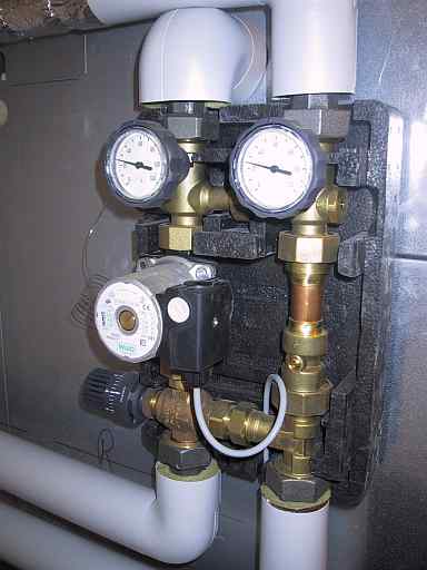 - Relativ unkompliziert verlief auch die Einbindung eines vormals vorhandenen 2.Heizkreises nach dem Schwerkraftprinzip. Übersehen wurde bei der Neuanbindung an den nunmehr einzigen Heizkreis mit Pumpe die Tatsache, daß es im alten Schwerkraftkreis auch noch einen Bypass gab. Dies fiel mir dadurch auf, weil die neue Pumpe ständig mit voller Leistung lief. Hier zeigte es sich, wie wichtig die Leistungsanzeige der Pumpe doch ist als Kontrollinstrument und daß man auf diese Anzeige nicht verzichten sollte (- falls man Kosten sparen möchte, dann besser anderswo.). Nach Abschließen des Bypass mit einer Rücklaufverschraubung war aber auch dieses Problem beseitigt.